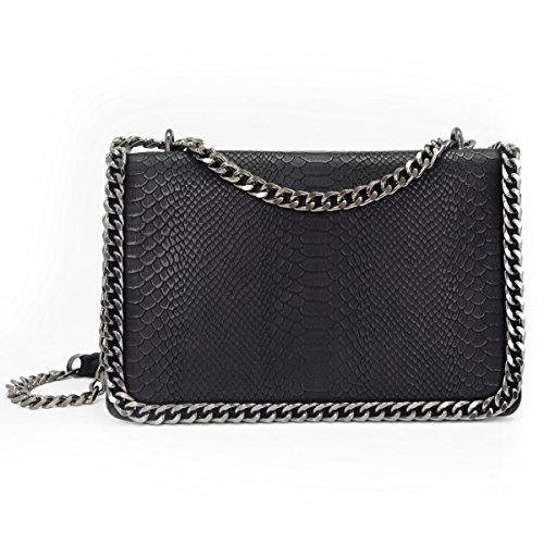 - MATERIAL & DETALLES: Piel sintética, solapa estructurada con patrón de serpiente pitón. Elementos metálicos negros. Cadenas de corte diamante (pulidas planas) para un máximo brillo.