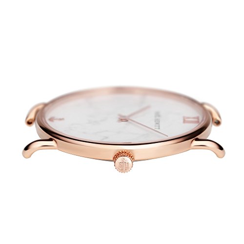 MATERIAL DE ALTA CALIDAD: La cubierta del reloj está hecha de acero inoxidable. La correa es de cuero en color carne. El resistente cristal de zafiro garantiza que se eviten los arañazos. La esfera es de mármol.