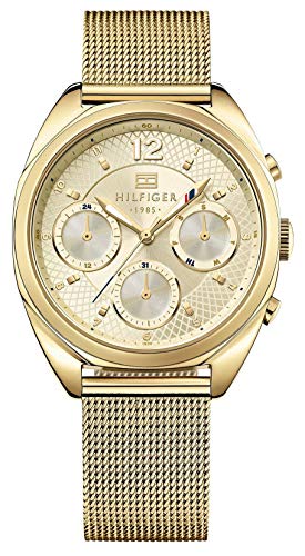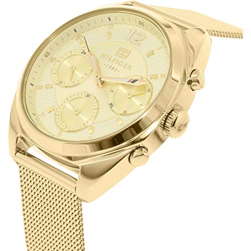 Este reloj superventas para mujer es el accesorio perfecto para cualquier conjunto. Se completa con una caja de acero inoxidable chapado en oro y una correa de malla de acero inoxidable chapado en oro a la moda. La esfera dorada tipo rayos de sol presenta un movimiento multifunción y una zona exterior en textura para un toque único.